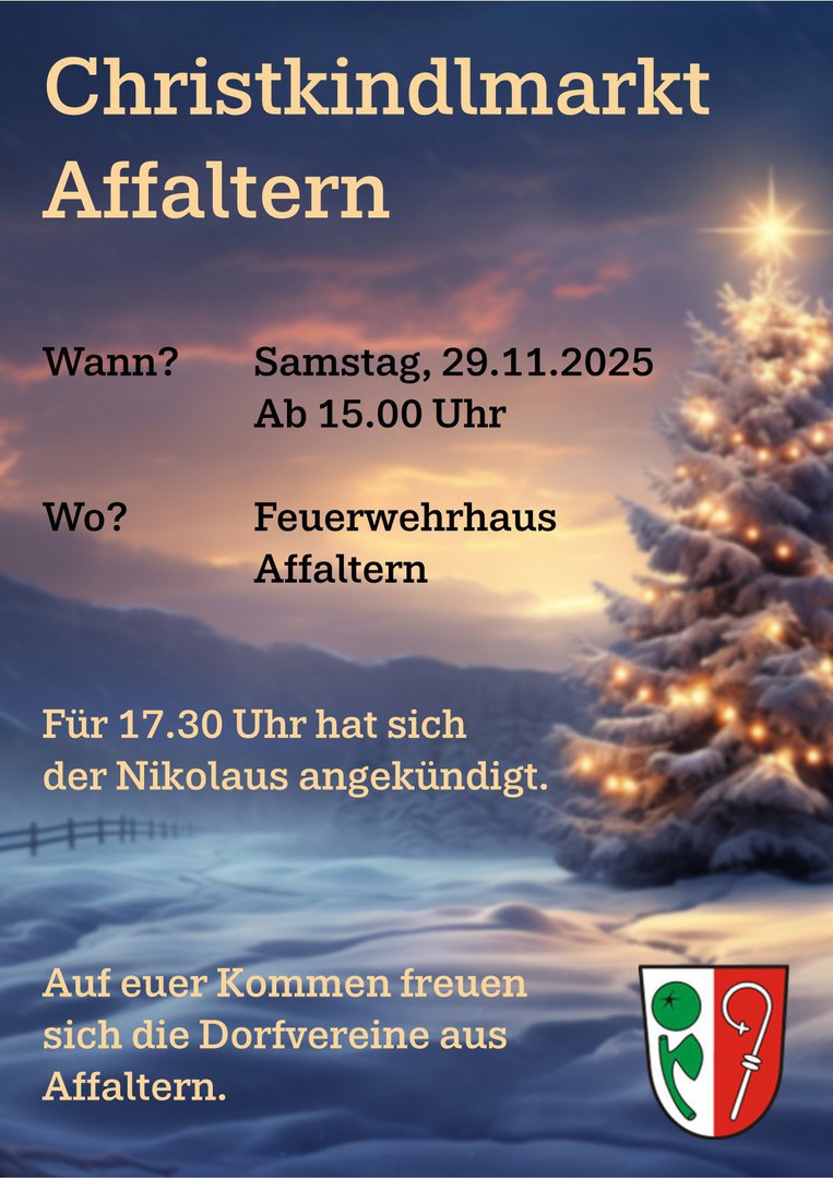 Die Dorfvereine Affaltern laden herzlich zum diesjährigen Christkindlmarkt nach Affaltern ein.